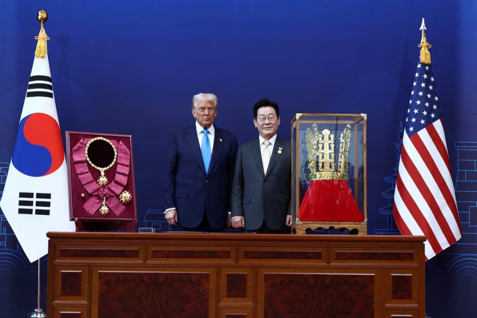 “এশিয়া-প্রশান্ত মহাসাগরীয় অর্থনৈতিক সহযোগিতা(এপেক) সম্মেলনে যোগ দিতে দক্ষিণ কোরিয়ায় পৌঁছে এক অনন্য সম্মান পেলেন যুক্তরাষ্ট্রের প্রেসিডেন্ট ডোনাল্ড ট্রাম্প। বুধবার প্রেসিডেন্ট লি জে মিয়ং ট্রাম্পকে উপহার দেন স্বর্ণের মুকুট। এটি প্রাচীন সিলা রাজ্যের ঐতিহ্যবাহী মুকুটের প্রতিরূপ। এই প্রতীকী উপহারটি দেওয়া হয় যুক্তরাষ্ট্রের সঙ্গে অচলাবস্থায় থাকা ৩৫০ বিলিয়ন ডলারের বাণিজ্য চুক্তি এগিয়ে নিতে কূটনৈতিক উদ্যোগের অংশ হিসেবে। ব্রিটিশ সংবাদমাধ্যম দ্য গার্ডিয়ান এ খবর জানিয়েছে”