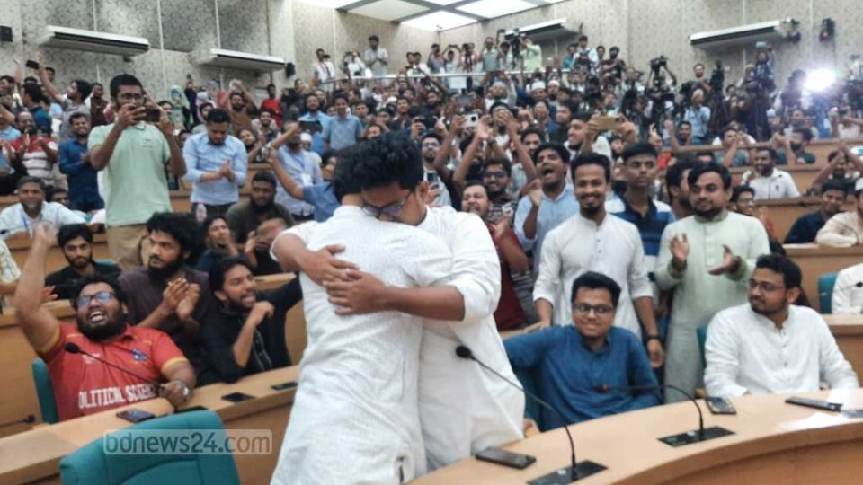 প্রতিদ্ব্ন্দ্বী জাতীয়তাবাদী ছাত্রদলের প্রার্থীদের বিপক্ষে ভূমিধসানো জয় পেয়েছেন তারা।