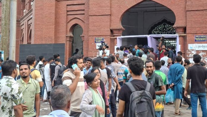 ঢাকা বিশ্ববিদ্যালয় ক্লাব কেন্দ্রে ভোট দিচ্ছেন বাংলাদেশ-কুয়েত মৈত্রী হল ও বঙ্গমাতা শেখ ফজিলাতুন্নেছা মুজিব হলের শিক্ষার্থীরা। এখানে মোট ভোটার সংখ্যা ৪ হাজার ৭৫৫। কেন্দ্র প্রধান রিটার্নিং কর্মকর্তা অধ্যাপক শারমীন কবীর বলেন, তার কেন্দ্রে ৭০ শতাংশের কাছাকাছি ভোট পড়েছে।